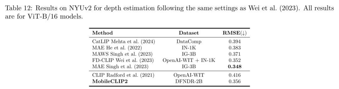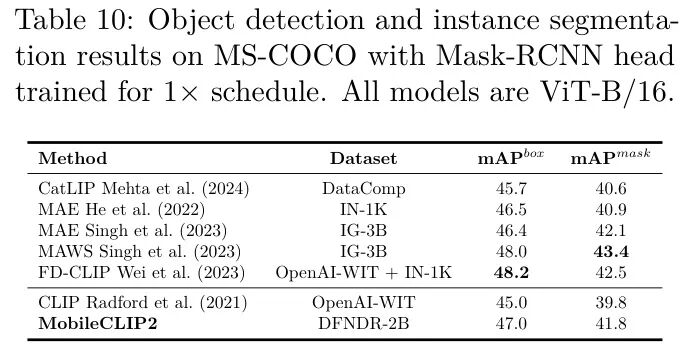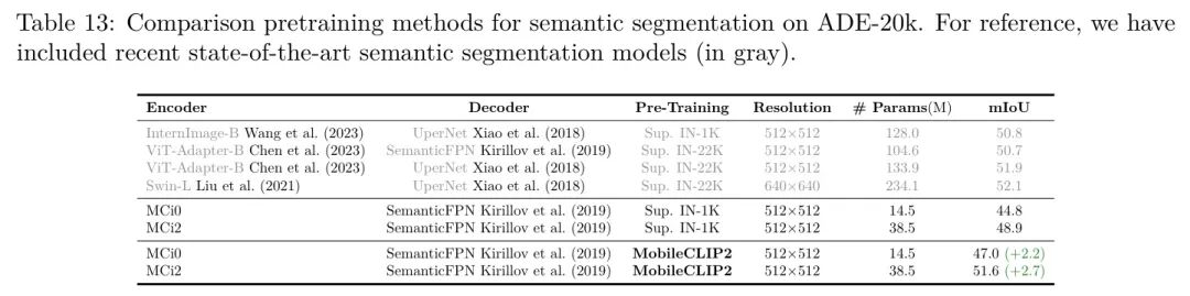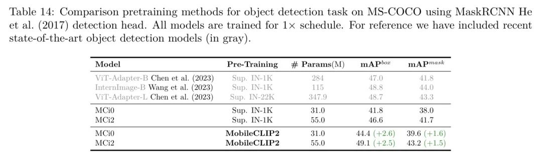 此外,作者评估了较小的MobileCLIP2变体在密集预测任务上的性能。流行的预训练方法如MAE(He等,2022)不直接适用于分层卷积和混合架构,如作者的MCi模型,因此作者将MobileCLIP2预训练与相同架构的监督预训练进行了比较。在表13和表14中,作者看到MobileCLIP2预训练明显优于监督预训练,并且可以成为分层架构的一个良好预训练选择。