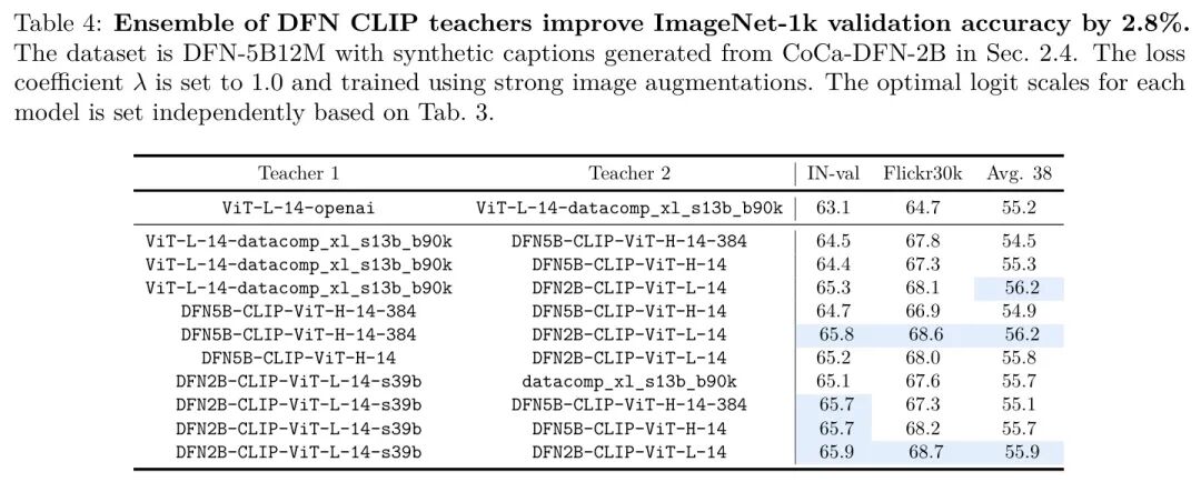集成教师。作者使用DataComp和DFN教师构建大小为二的集成。表4展示了使用各种集成的嵌入训练MobileCLIP-B模型的性能。与MobileCLIP中使用的教师相比,作者观察到显著的改进。具体而言,IN-val和Flickr30k的性能提高了高达3%。基于其性能和成本效率,作者为MobileCLIP2选择了DFN2B-CLIP-ViT-L-14-s39b和DFN2B-CLIP-ViT-L-14的集成,与其他更大或更高分辨率的集成相比。作者利用为集成中每个成员独立找到的最优logit尺度。当一起使用时,集成的最优logit尺度可能会有所不同,但作者没有进一步联合优化logit尺度。