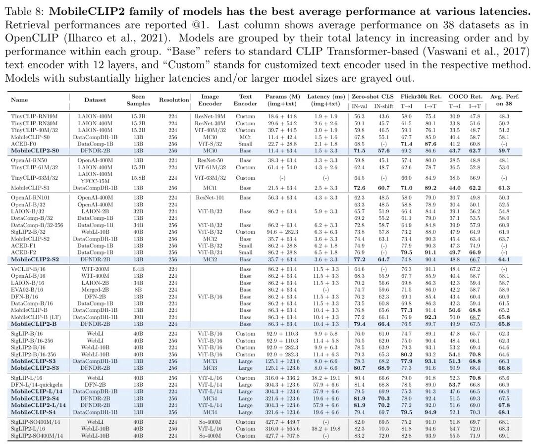 在本节中,作者训练了一个新的高效CLIP模型系列MobileCLIP2,并在多样化的任务集上进行了评估。根据作者在第2节的发现,作者创建了增强数据集DFNDR-2B,其中包含由作者的CoCa-ViT-L/14模型生成的五个合成标题,该模型在DFN-2B上预训练并在MSCOCO-38K上微调。DFNDR-2B还包含来自CLIP模型集成DFN2B-CLIP-ViT-L-14-s39b和DFN2B-CLIP-ViT-L-14的图像文本嵌入,适用于所有图像、真实标题和合成标题。与MobileCLIP相比,作者训练了更多样化的架构系列,并在38个零样本分类任务上评估了它们的性能(Gadre等人,2023)。特别是,作者介绍了在DFNDR-2B上训练的MobileCLIP2-S3和MobileCLIP2-S4架构,以及在DataCompDR-1B上训练的变体,作者称之为MobileCLIP-S3和MobileCLIP-S4。表8显示了作者的结果与其他具有相似延迟的模型的比较。训练和超参数的细节在附录A中描述。