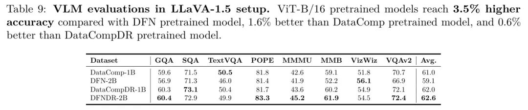 作者报告了在LLaVA-1.5设置(Liu et al., 2024a)中使用MobileCLIP2预训练模型进行的视觉语言评估。作者在所有运行中保持视觉 Backbone 网络冻结,并使用Qwen2-7B替代Vicuna-7B。所有其他训练细节与原始LLaVA-1.5设置相同,更多细节在附录中提供。作者评估了在DataComp、DFN、DataCompDR和DFNDR上预训练的ViT-B/16模型,针对130亿个已见样本。在表9中,作者观察到平均而言,在DFNDR上训练的模型比DFN预训练模型的准确率高3.5%,比DataComp预训练模型高1.6%,比DataCompDR预训练模型高。