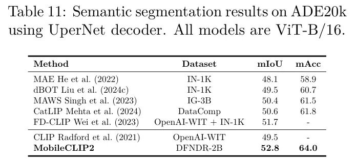 3. 在密集预测任务(如实例分割、语义分割和深度估计)上,MobileCLIP2预训练显著优于监督预训练,成为分层架构的良好预训练选择。