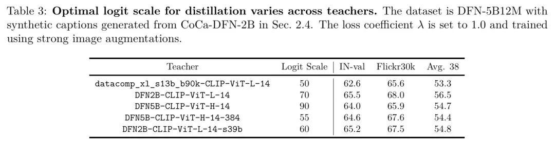 Logit scaling. CLIP模型在训练过程中使用一个在0-100范围内调整的logit scale进行训练。MobileCLIP使用与KD loss中的temperature scaling相同的logit scalar。作者观察到DFN和DataComp模型中的logit scalar对于KD并非最优,因此作者进一步调整了该参数。表3显示了用于训练MobileCLIP-B模型的每个教师模型所使用的最优logit scale。作者观察到logit scale不是一个敏感的hyperparameter,在5点范围内的值都能达到相似的性能。