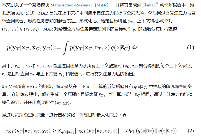 不同于使用小规模神经网络的标准 ANP,集成了来自 OpenVLA 的预训练 Llama2 主干。MAR 同时生成随机与确定性的上下文潜在向量,并在最终输出层之前与 Llama 的隐藏状态进行拼接。组合后的表征随后通过语言模型头(LM head)产生输出 logits,从而可通过标准的 Llama 解码实现端到端训练。框架概览见下图2。
