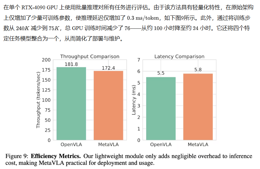 全面实验表明,MetaVLA 在显著提高效率的同时提供了更优的性能,通过减少模型数量和 GPU 训练时间来实现,同时保持快速的推理速度。