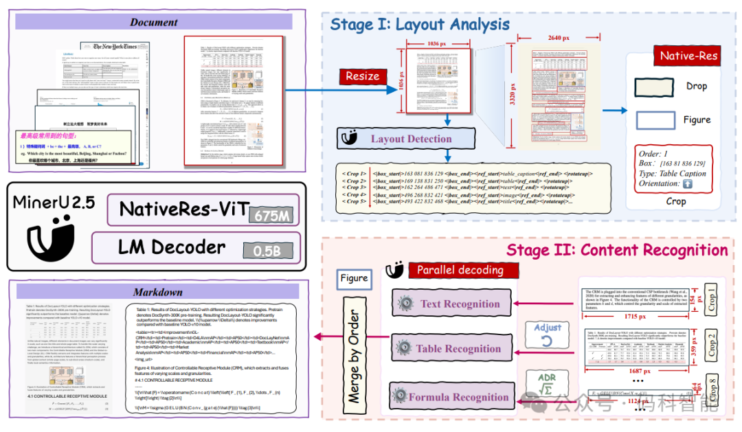 第二阶段,在全局版面先验的引导下,从原图截取关键区域,以原生分辨率进行精细内容识别,从而保留密集文本、复杂公式和表格中的细粒度细节。