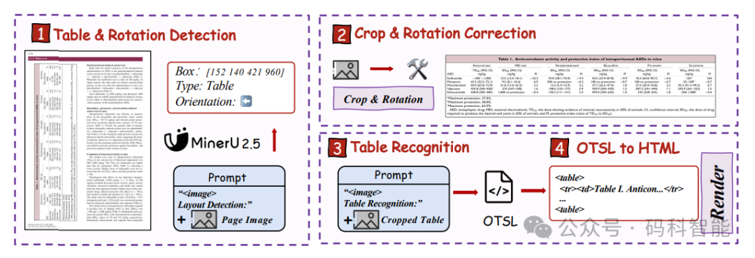 首先检测表格边框与旋转角,裁剪并旋转至规范方向;然后对矫正后图像进行识别,得到 OTSL 结构,其与表格视觉 2D 矩阵直接对应,平均序列长度缩短约 50%,显著降低模型生成难度;最终将其直接转换成标准 HTML,简单高效。