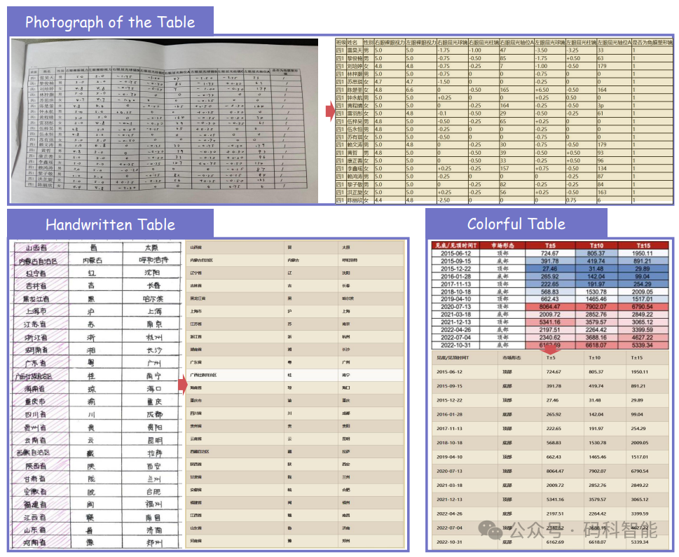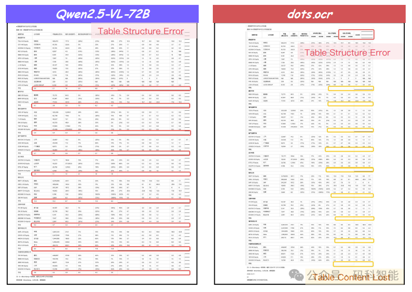 原论文通过多页文档的解析输出样例,定性展示 MinerU2.5 的能力,在包含复杂元素的 PDF 页面中,MinerU2.5 全面领先现有 SOTA 模型,比如整页表格、内容极密表格、大量空单元格彩表、多表紧密排列、不规则合并单元格表、完全无线表——竞品出现“结构错误、结构丢失、内容丢失、表格分裂”等错误时,MinerU2.5 仍能输出正确结果。