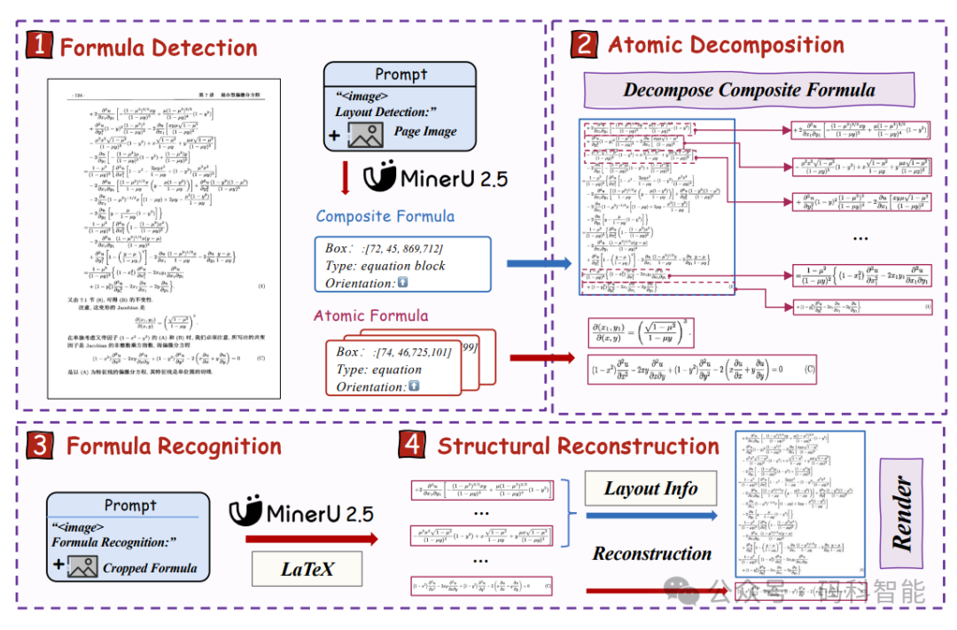 整个处理流程由通用 MinerU2.5 驱动,它既充当版面分析器,又充当识别引擎。通过版面分析将复合公式拆分为原子行,分别裁剪成独立图像,然后每行独立识别为 LaTeX,最后利用初始版面分析得到的行位置信息,把各片段按顺序、对齐关系重新拼装成单个完整的公式块。