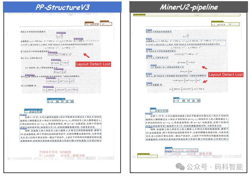 针对图文交替复杂版面、极细框线表格、带水印页面——MinerU2.5 依旧表现优异,竞品则出现漏检、错检或水印干扰导致的全面失效。更多对比结果可查阅原论文。