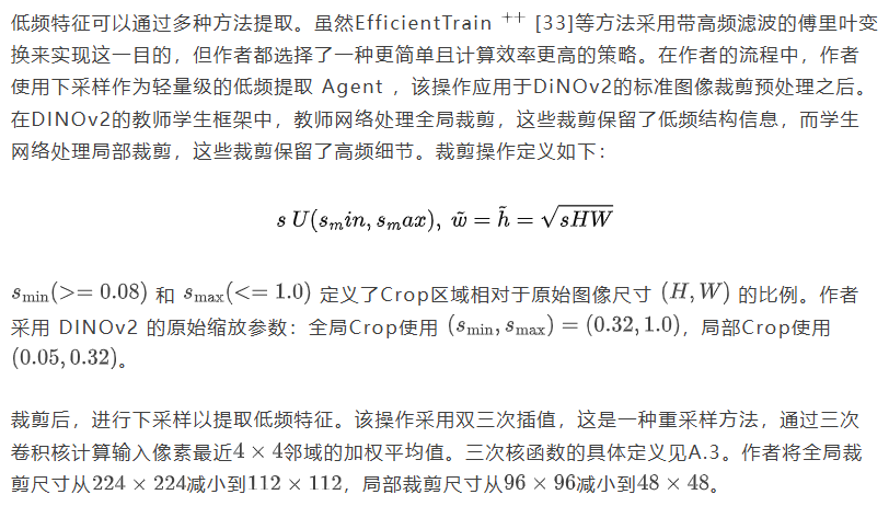 训练课程学习[5]通过先在简单样本上进行逐步训练,再推进到更复杂的样本,从而提升模型性能。在FastDINOv2中,作者将图像的低频分量——代表粗略的大规模模式——定义为较容易的样本,逐步过渡到由原始图像表示的更难样本。作者的课程由两个阶段组成。在前75%的训练周期内,模型仅在这些低频分量上进行训练。随后,作者通过重置Adam优化器的训练动态来应用重启机制。在第二阶段,作者在剩余周期内对包含低频和高频信息的原始图像训练DINOv2。为确保训练稳定性,作者在两个阶段中都保持固定的批处理大小。