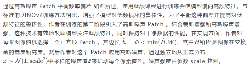 阶段2 - 全分辨率与高频增强。随后作者过渡到全分辨率输入,同时引入高斯噪声 Patch ,即随机图像块被噪声替换。这迫使模型学习对高频扰动的不变性,并提高鲁棒性。