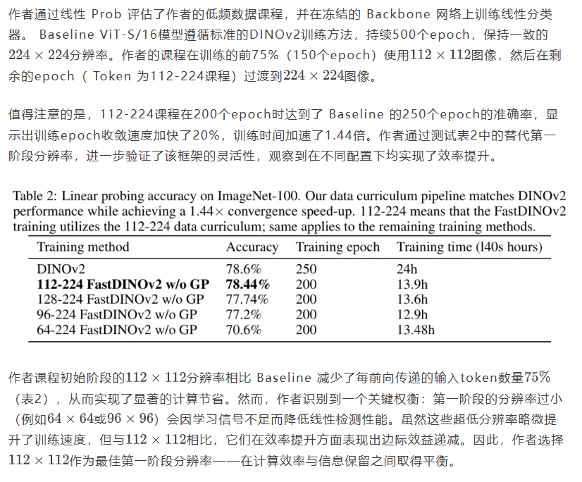 • 在线性分类任务中,FastDINOv2在200个epoch即达到Baseline 250个epoch的准确率。