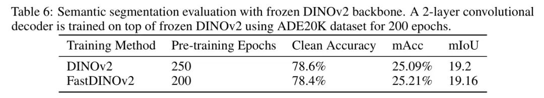 第4.2节和第4.5节表明FastDINOv2在保持线性 Prob 的同时实现了更快的收敛,并提升了实例识别精度,证明了图像和实例级任务依然具有优势。然而,由于语义分割需要细粒度的像素理解,作者需要验证FastDINOv2——该方法将训练时间的75%用于低频特征——是否仍能在此类任务上表现良好。为此,作者使用ADE20K进行了语义分割实验。作者冻结了使用作者课程训练的DINOv2主干网络,仅训练一个2层卷积解码器,并使用平均IoU(mIoU)和平均类别精度(mAcc)指标进行性能评估。表6表明,作者的112-224课程与高斯 Patch 匹配的分割性能(mIoU/mAcc)仅需200个epoch即可达到DINOv2 Baseline 的水平。尽管初始阶段进行了低频训练,第二阶段成功恢复了分割任务所需的细粒度像素理解能力。