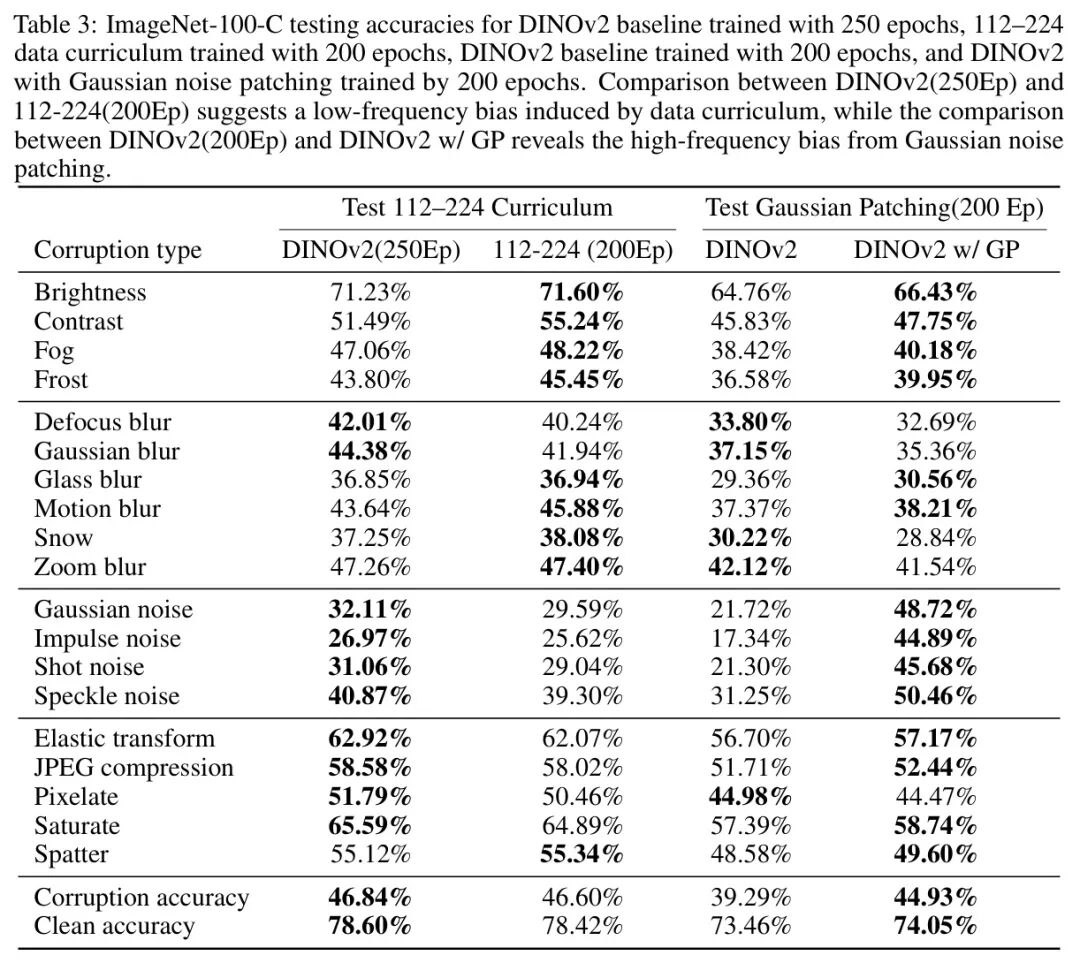 • 作者对使用低频数据课程预训练的模型进行了全面的鲁棒性和频率分析——这是一个尚未充分探索的方向。作者识别出这种训练方案引入的低频偏差,并提出高斯噪声 Patch 作为增强鲁棒性的补充数据增强方法。