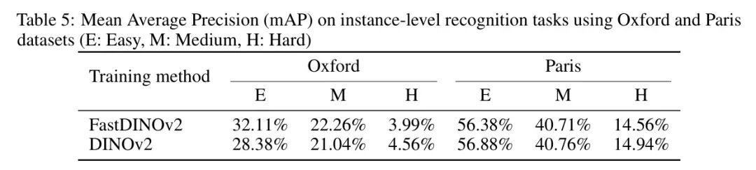 基于线性 Prob 所展现的性能,作者进一步通过实例识别任务在实例级上评估FastDINOv2。具体而言,作者在牛津和巴黎数据集上评估了三个难度 Level ,并在表5中报告了平均精度均值(mAP)。在牛津数据集上,FastDINOv2在简单划分上比DINOv2提高了3.73%,在中等划分上提高了1.22%,但在困难划分上略有下降。在巴黎数据集上,两个模型的性能相当。这些结果表明,FastDINOv2不仅加速了收敛,而且在各种任务上提升了性能。