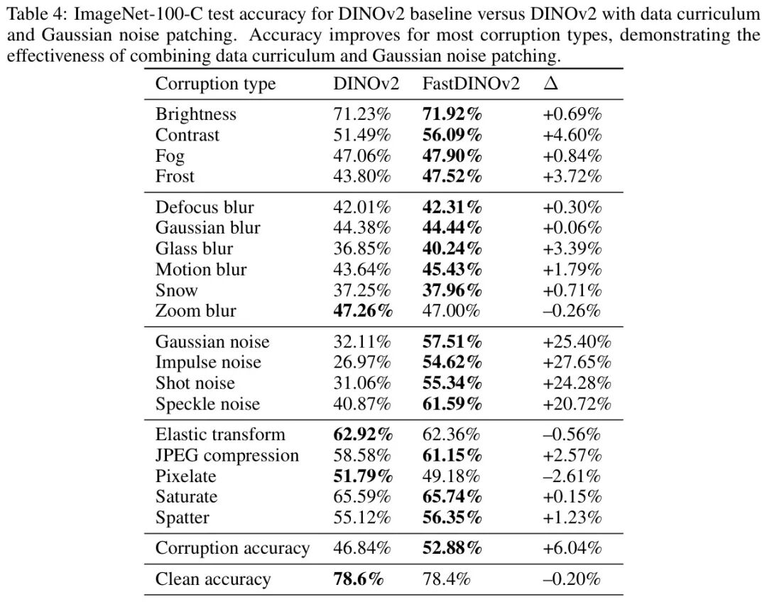 • 在ImageNet-C基准测试中,FastDINOv2在保持与Baseline相当的鲁棒性的同时,对多种损坏(如高斯噪声、散焦模糊)表现更好。