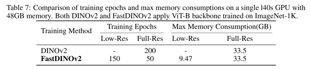 GPU内存消耗巨大是预训练扩展的关键 Bottleneck 。然而,在第一阶段使用低分辨率图像,FastDINOv2允许显著降低内存需求。如表7所示,在训练的前75%的epoch中,FastDINOv2在每GPU批处理大小为128时,最大内存消耗为9.47GB,显著低于相同批处理大小下DINOv2 Baseline 的33.5GB。这种内存需求的降低表明,在大部分预训练epoch中,可以利用内存容量较低的GPU来构建成本效益更高的模型。