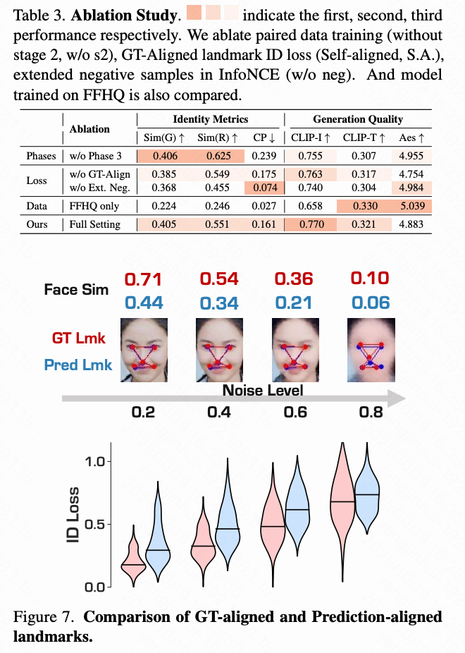 如下表 3 所示,配对数据微调阶段在减少复制粘贴伪影的同时,不会降低与真实值的相似性,而在 FFHQ 上训练的效果显著差于在本文精心策划的数据集上进行训练的效果。下图 7 进一步表明,GT 对齐的 ID 损失在低噪声水平下降低了去噪误差,并在高噪声下产生更高方差、信息更丰富的梯度,从而增强身份学习能力。通过消融扩展的反例,只留下批次中的 63 个负样本(最初扩展到 4096 个),ID 对比损失的效果显著降低。