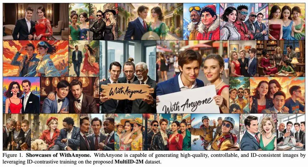MultiID-2M:一个包含50万张包含多个可识别名人的团体照片的大规模数据集,每个名人有数百张参考图片,展现各种多样性以及额外的150万张未配对的团体照片。这一资源支持多身份生成模型的预训练和评估。