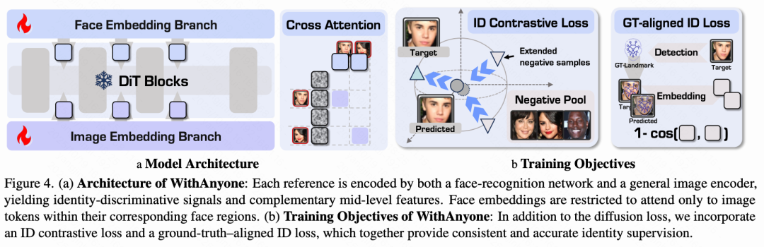 基于 MultiID-2M 的规模及配对参考监督,本文设计训练策略和定制目标,以超越重建,达到稳健的、条件于身份的合成。这种丰富的、标记身份的监督不仅大幅提升了身份保真度,还抑制了简单的复制粘贴伪影,并提供了对多身份组合的更精细控制。受到这些优势的启发,本文引入了 WithAnyone ——一个面向可控、高保真多身份生成的统一架构和训练方案。架构图和实现细节见下图4。