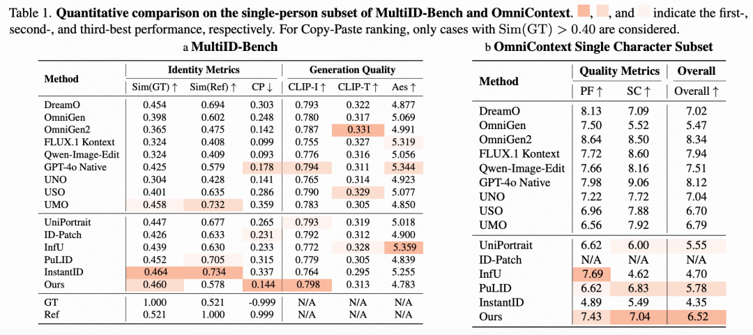 复制粘贴伪影是身份定制方法的常见限制,而脸部相似性指标通常通过隐性奖励直接复制来加剧这一问题。本工作通过 MultiID-Bench 确定并正式量化了这种失效模式,并提出了针对性的解决方案。策划了 MultiID-2M,并开发了明确拒绝简单复制的训练策略和损失函数。实证评估表明,WithAnyone在显著减少复制粘贴伪影的同时,保持并在许多情况下提高了身份相似性,从而打破了忠实度与复制之间的长期权衡。这些结果突显了一条实现更忠实、可控和稳健的身份定制的实际路径。