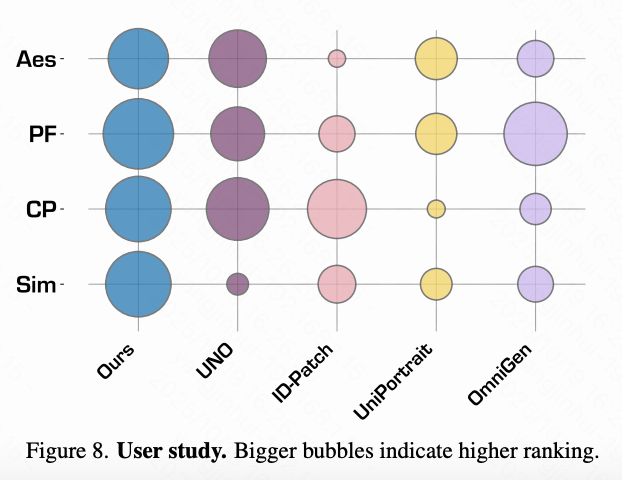本文进行了一项用户研究来评估感知质量和身份保留。招募了 10 名参与者,并要求他们根据四个标准对 230 组生成的图像进行排名:身份相似性、复制粘贴伪影的存在、提示的遵循和美学。结果如下图 8 所示,表明本文的方法在所有维度上始终获得最高的平均排名,展示出了更强的身份保留和卓越的视觉质量。此外,复制粘贴指标与人类判断呈现适度的正相关性,表明其捕获了具有感知意义的伪影。