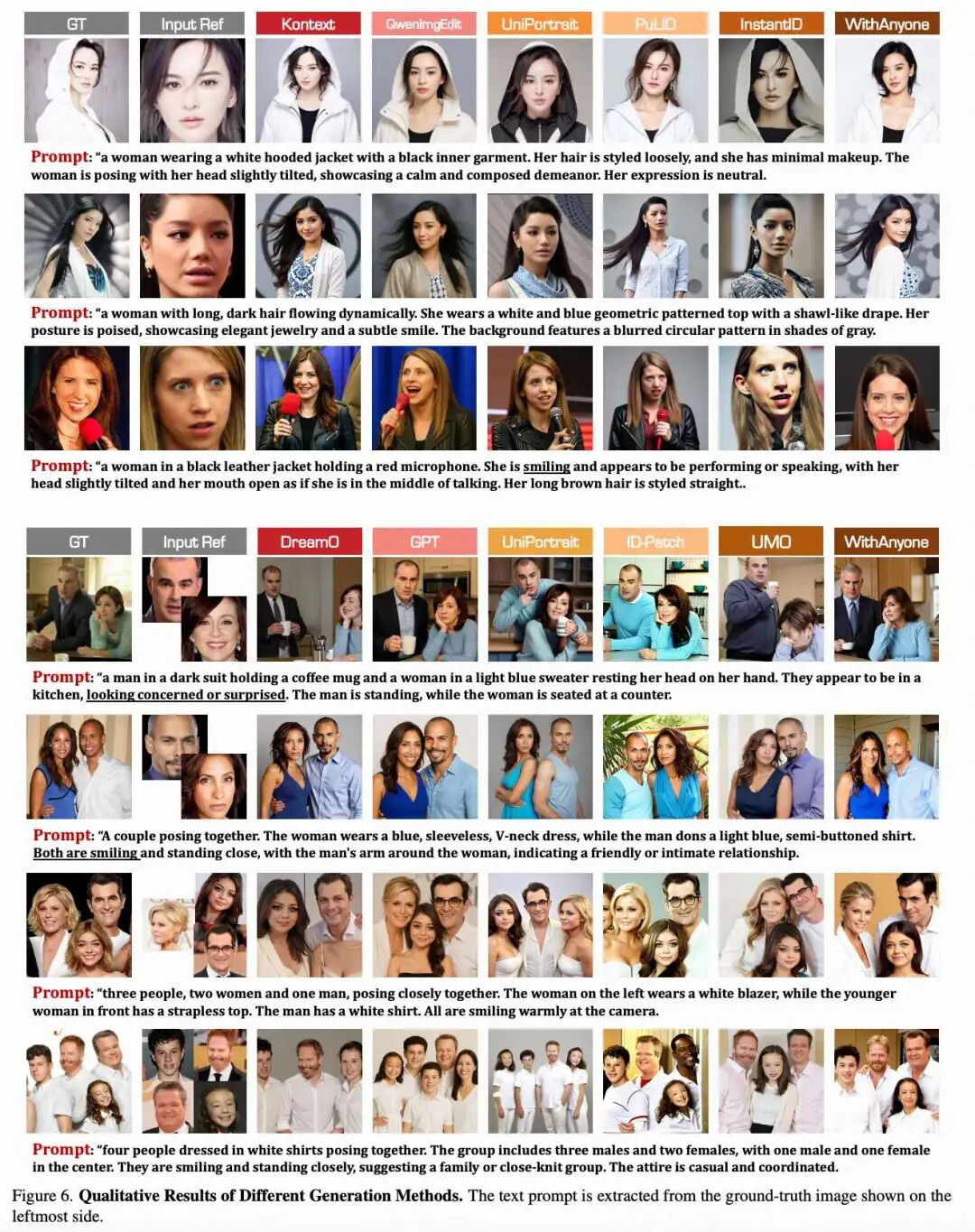 基线。 评估了两类基线方法:通用定制模型和面部定制方法。通用定制模型包括 OmniGen、OmniGen2、Qwen-Image-Edit、FLUX.1 Kontext、UNO、USO、UMO 和本机 GPT-4o-Image。面部定制方法包括 UniPortrait、ID-Patch、PuLID (在本文中指其 FLUX 实现)和 InstantID。所有模型均在基准的单人子集上进行评估,而仅支持多 ID 生成的模型还在多人子集上进行测试。