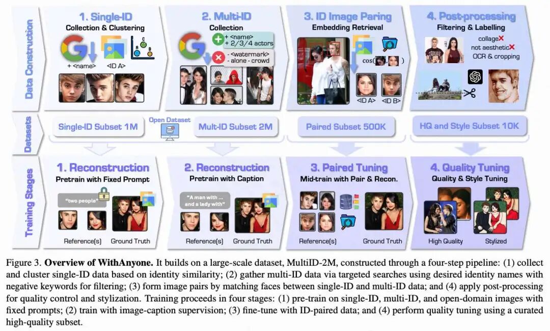 MultiID-2M 是通过一个四阶段流水线构建的大规模多人数据集:(1)从网络收集单一ID的图片,并通过聚类 ArcFace嵌入构建一个干净的参考库,得到大约 100 万张参考图片,涉及约 3000 个身份(平均每个身份 400 张);(2)通过多姓名和场景感知查询检索候选团体照片,并检测面部;(3)通过将 ArcFace 嵌入与单一ID聚类中心进行余弦相似度匹配(阈值为 0.4)来分配身份;(4)进行自动过滤和标注,包括识别任何东西,审美评分,基于 OCR 的水印/标志移除,以及基于LLM的字幕生成 [1]。最终的数据集包含约 50万张已识别的多ID图片,这些图片与参考库中的参考图片匹配,还包括约 150 万张用于重建训练的未识别多ID图片,涵盖约 25000 个独特身份,具有多样的国籍和种族。