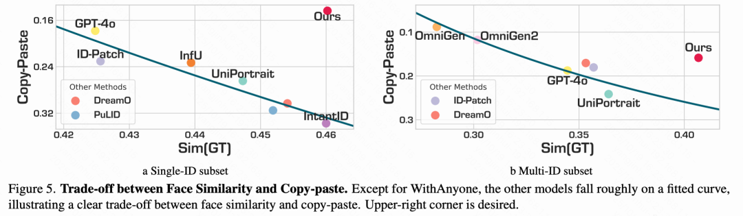 定量结果见下表 1 和 2。本文观察到面部相似性与复制粘贴伪影之间的明显权衡。如下图 5 所示,大多数方法与一个回归曲线密切对齐,其中较高的面部相似性通常与更强的复制粘贴一致。这表明许多现有模型通过直接复制参考面部特征来提高测量的相似性,而不是合成身份。相比之下,WithAnyone 显著偏离这一曲线,在相对于 GT 的面部相似性方面达到最高,并保持明显较低的复制粘贴得分。