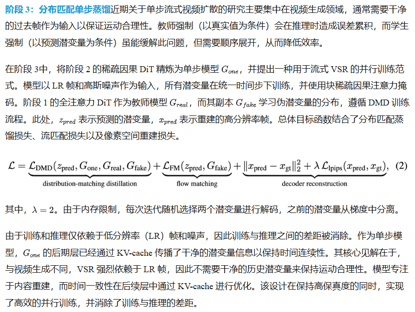 为构建一个高质量且高效的 VSR 模型,本文设计了一个三阶段蒸馏管线:(1) 图像–视频联合训练以建立强教师模型,(2) 因果稀疏注意力适配以实现流式高效,(3) 分布匹配蒸馏以获得单步学生模型。