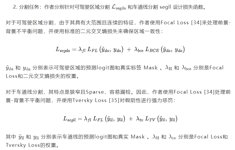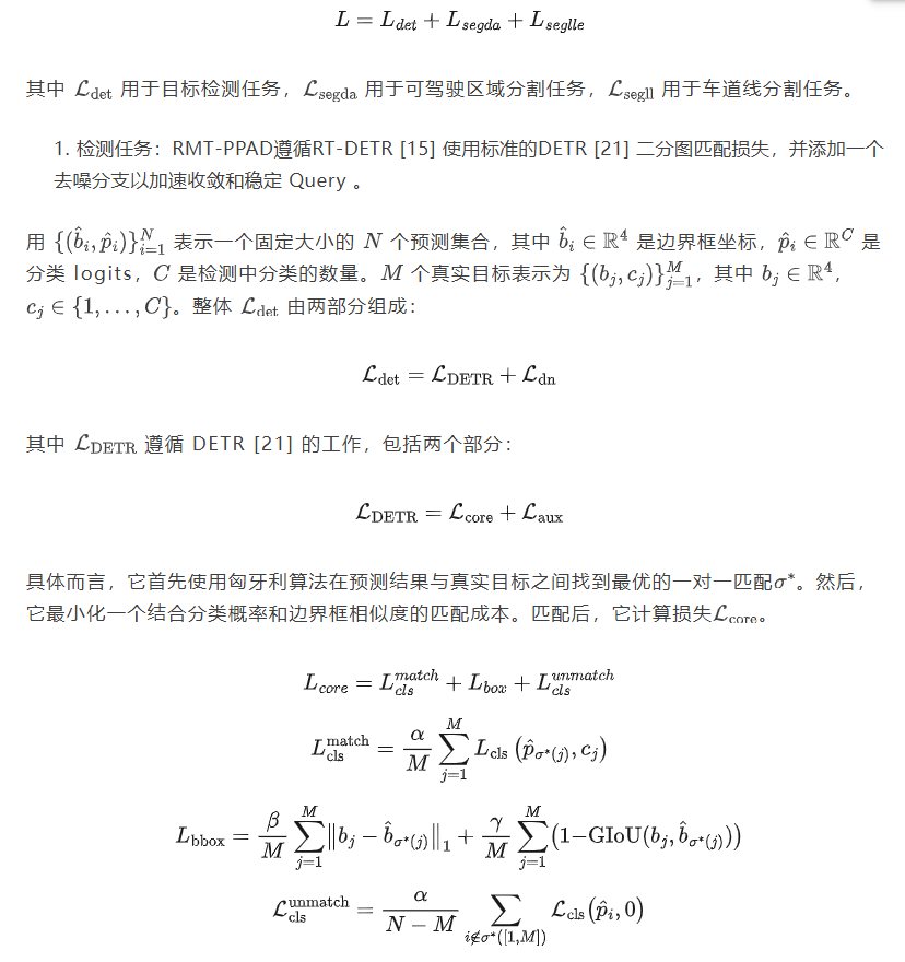 RMT-PPAD采用端到端结构训练策略。因此,其目标函数包含多个用于不同任务的损失函数。具体而言,它由一个检测损失函数和两个分割损失函数组成。公式如下所示: