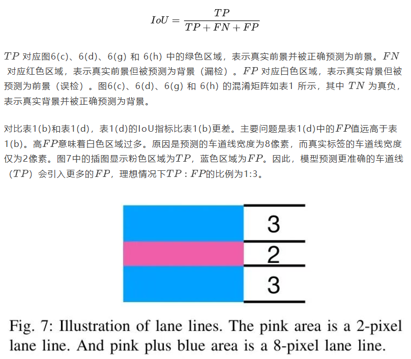 为展示这一问题,作者从BDD100K [16]数据集中采用了一个名为b9e91422-944c7a2f的样本。比较图6(b)和6(f)与6(a),通过可视化评估,YOLOPX的表现远优于A-YOLOM。然而,IoU的定量结果却相反。比较图6(c)和6(g)的结果,IoU结果显示A-YOLOM优于YOLOPX。这种矛盾产生的原因是测试标签使用2像素宽度的车道线,而训练标签使用8像素宽度[14]。因此,预测的 Mask 更加准确,假阳性(FP)率更高,这将负面影响IoU,从而错误地评估模型性能。接下来,作者将使用公式和混淆矩阵来证明这一点。