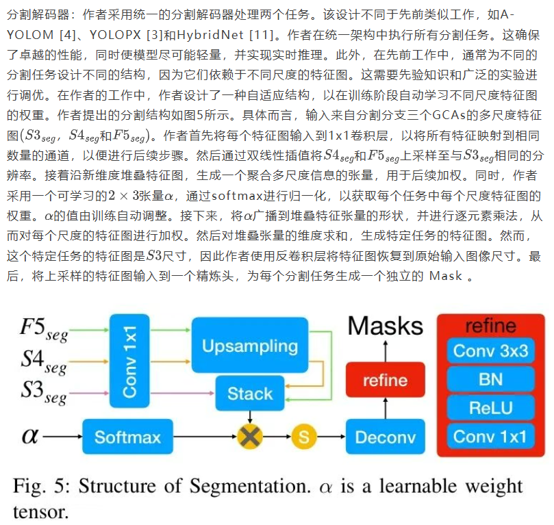 3. 分割解码器中的可学习权重:训练完成后,作者检查分割解码器中多尺度特征图[S3、S4和F5]的学习权重。对于可驾驶区域分割,权重为[0.355, 0.156, 0.489]。对于车道线分割,权重为[0.405, 0.442, 0.153]。这些结果与任务需求一致。具体而言,可驾驶区域较大且连续,更受益于High-Level特征,如F5。而车道线较窄且具有细粒度特征,更多依赖Low-Level细节特征,如S3和S4。这些结果表明,作者提出的自适应分割解码器能够在训练阶段自动学习并为不同尺度的特征图分配适当的权重。