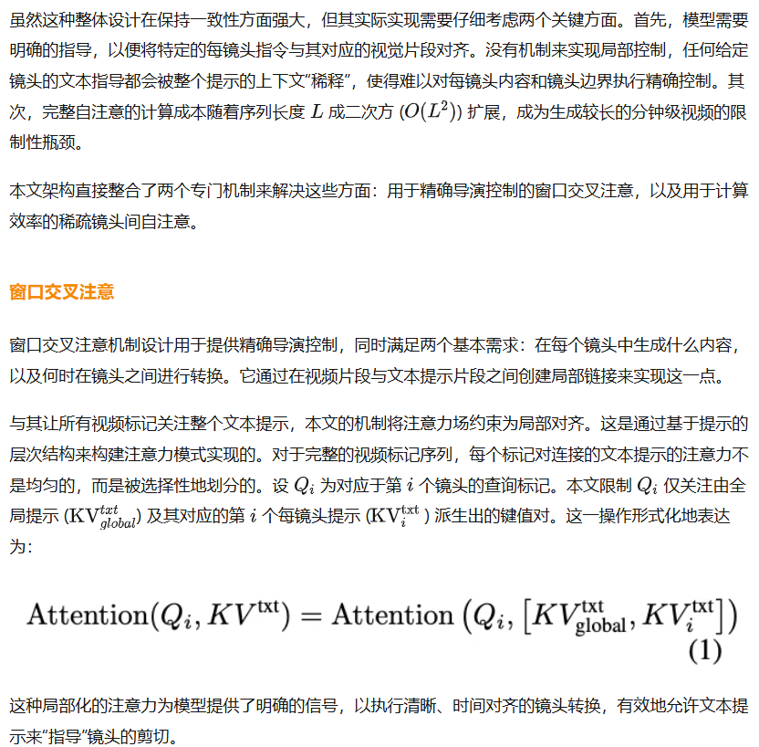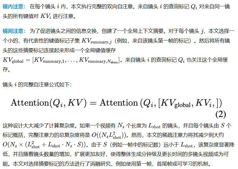 利用稀疏镜头间自注意机制(在镜头内密集注意,镜头间稀疏连接)提高效率,实现分钟级的整体生成。
