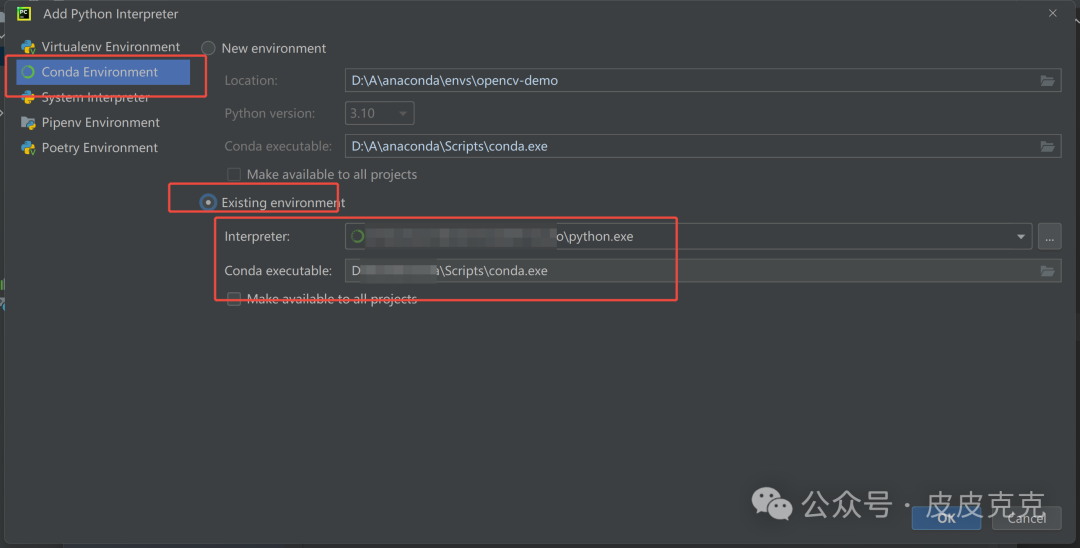 选择 "Conda Environment",选择 "Existing Environment"