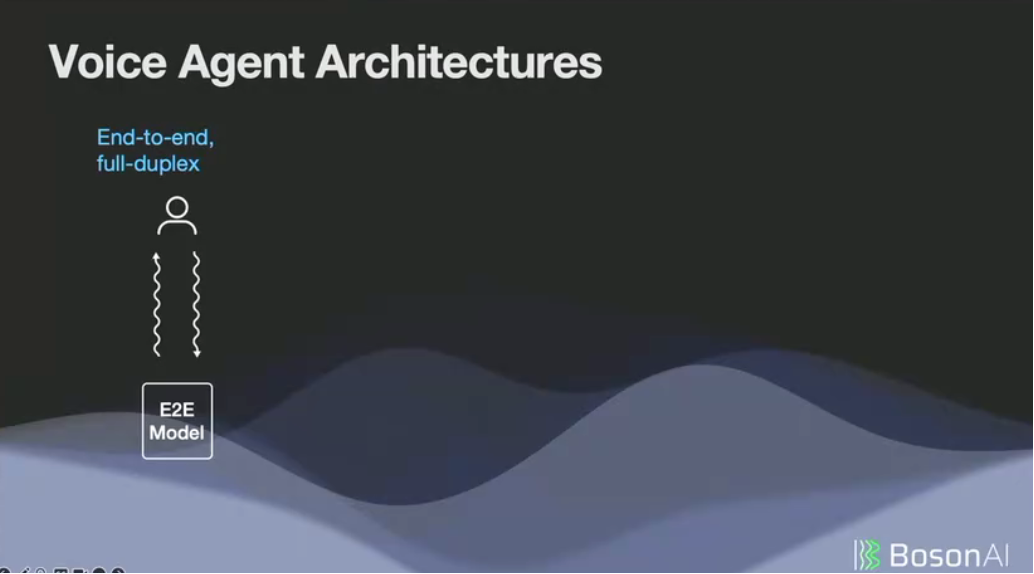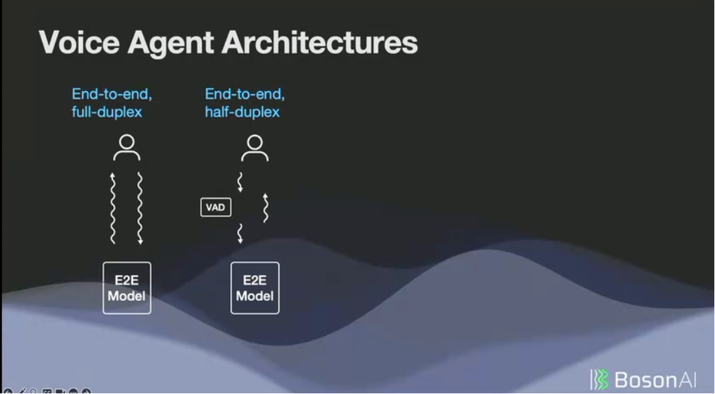 在大多数实际应用中,例如GPT-4o,使用的是端到端半双工(half-duplex)。 也就是说,系统通过语音活动检测器(VAD)判断用户是否在说话,把语音分成一个个片段输入模型,模型对上一段内容生成回应。所以这是半双工的机制。