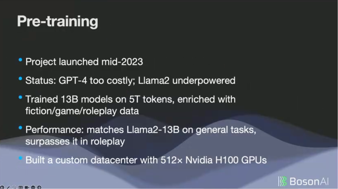 当时最好的开源模型是Llama 2,但性能还不够强。于是我们自己预训练了一个300亿参数的模型,用了大约5万亿tokens。这些训练数据主要来自小说与角色扮演游戏文本。