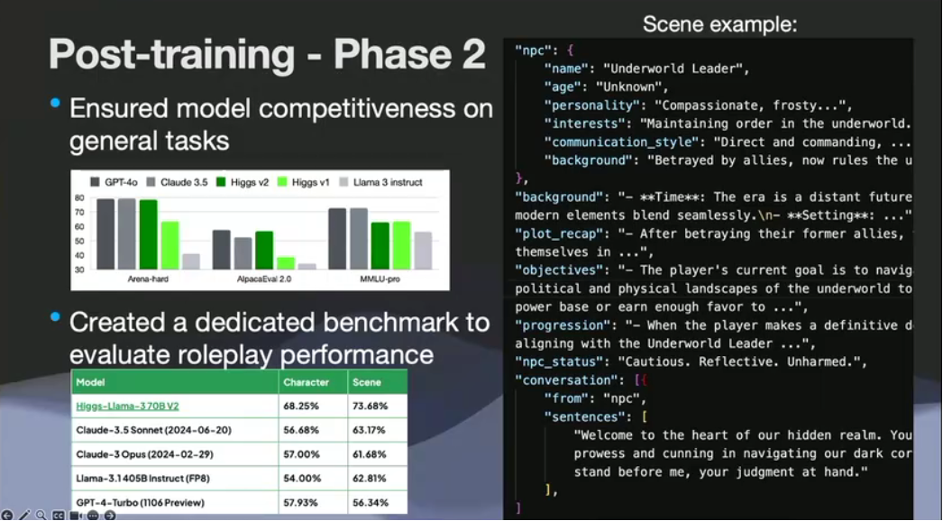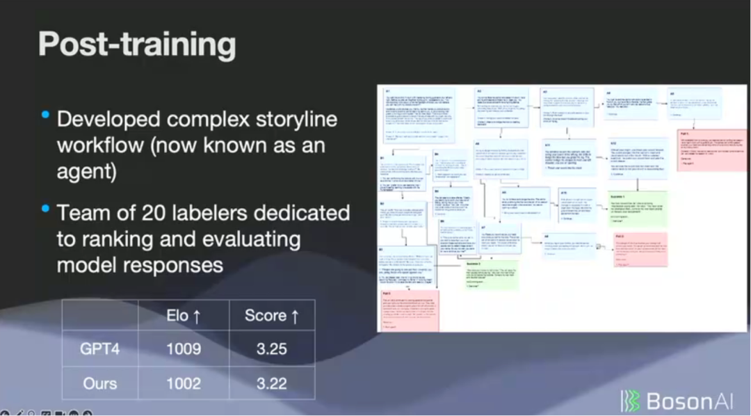 之后我们转向后训练(post-training),这是关键所在。我们的剧情工作流非常复杂。这里展示的只是一个简化示例,真实的更复杂。
