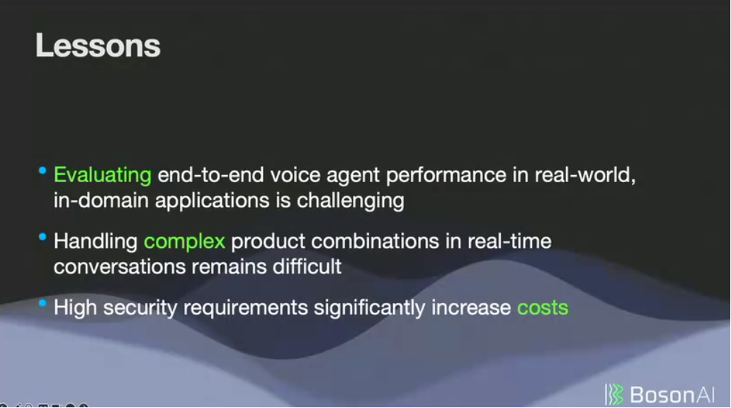 我们在这里学到的经验是,评估端到端语音智能体非常团难,因为必须通过真人通话测试。一旦涉及真人通话,就很难实现自动化评估。但如果没有这种测试,就无法真正衡量系统整体表现。