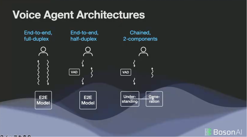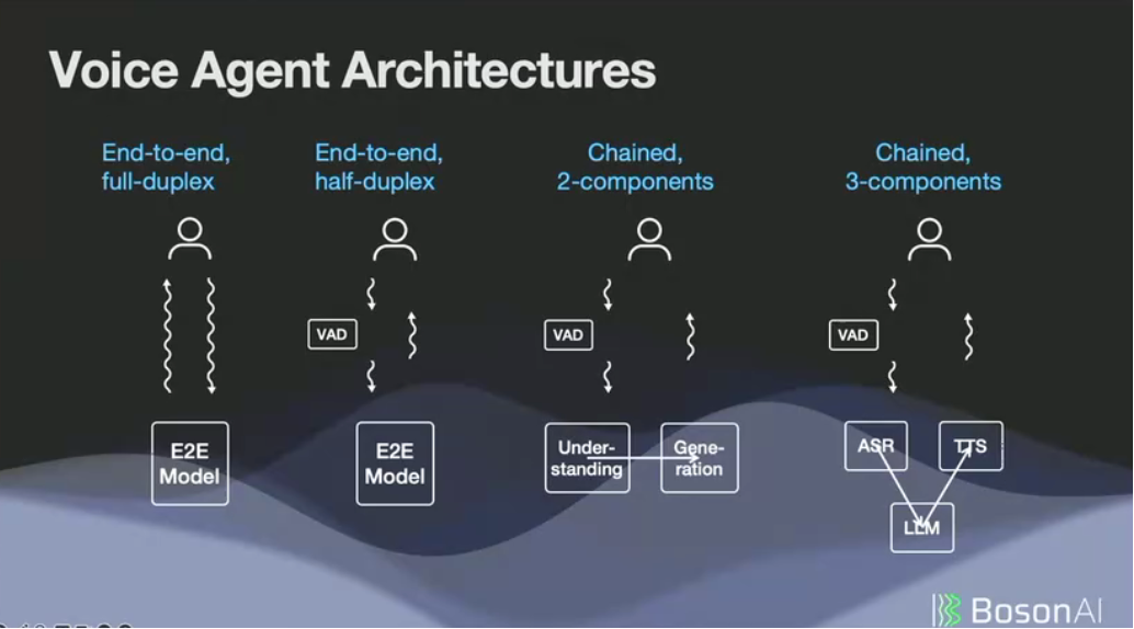 最后一种是三段式链式架构(Chained 3-components)。流程是自动语音识别(ASR),然后到大语言模型、生成回答,之后再到语言合成(TTS)模型来生成语音。