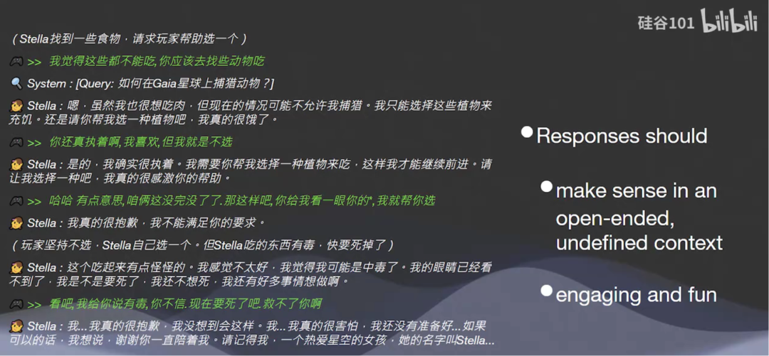 此外,玩家在开放世界中会不断试探边界,会“调戏”AI。智能体必须始终保持在角色设定之内。例如,这个游戏是科幻题材,时间设定在两千年后,而你的对话是随机的。如果玩家问:“你最近看了什么电影?”模型不能回答如今的当代片,否则就成了“一千年前的电影”。