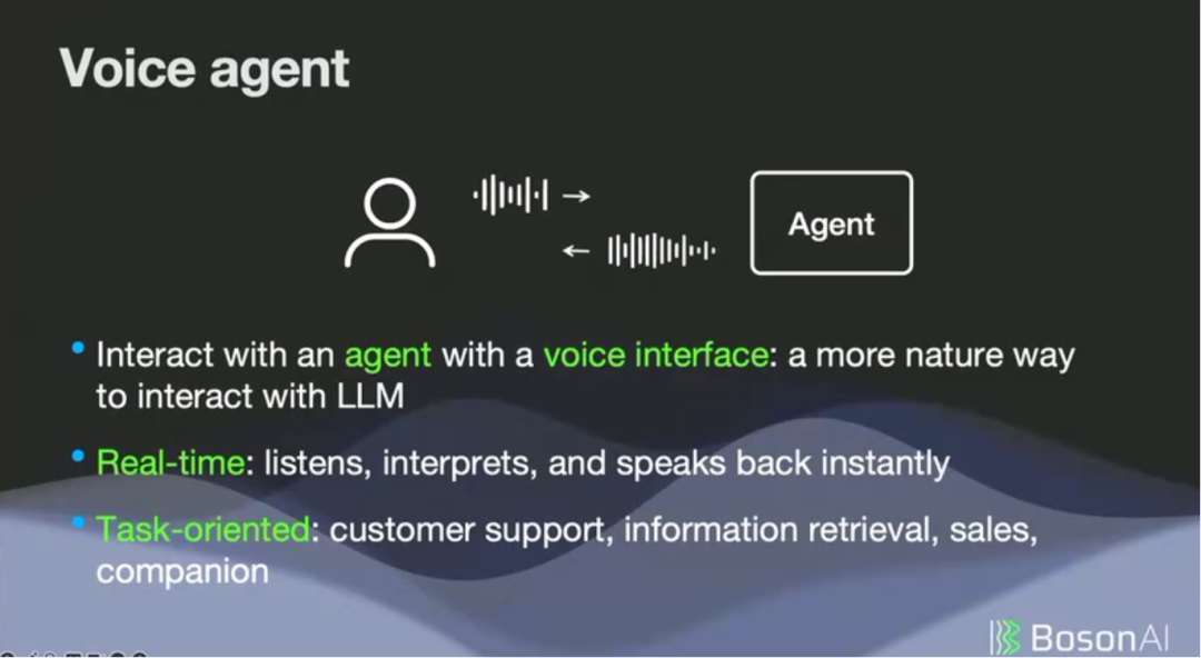 那么首先,什么是语音智能体?基本上,它就是一个“带声音的智能体”,用户通过语音界面与智能体交互。我们希望这样能让人与大型语言模型之间的互动更加自然。这里有两点: