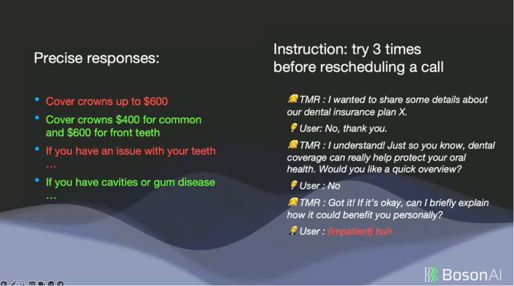 所以,“如果你的牙齿出现任何问题”这样回答是不准确的。“如果你的牙齿出现(具体)问题,(赔付是多少)” 这样的回答才是准确的。如果智能体的回答是前一个(非具体项目),这个回答就失败了。
