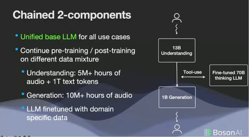 另一种方案是二段式链式架构(Chained 2-components)。它同样是轮流说话的模式,但使用两个模型而非一个。第一个模型负责理解,接收音频、生成文本响应。第二个模型负责生成,将文本转换为语音输出。