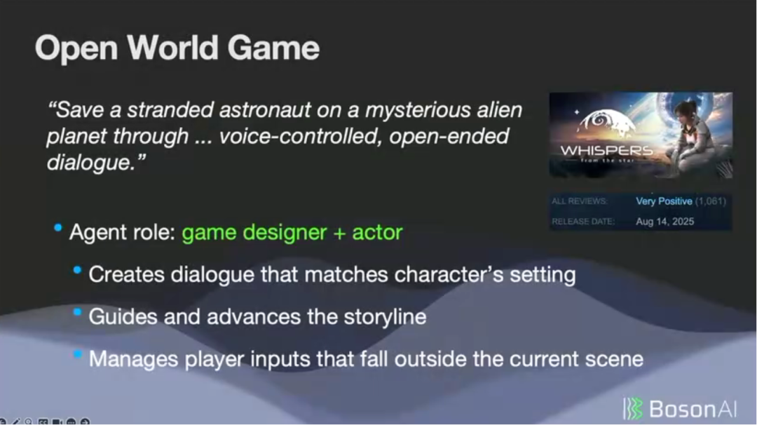 可以说,整个故事情节都是由玩家的语音输入推动的。这是一款开放世界游戏。 上面那句话就是从游戏中截取的台词。这款游戏在两个月前上线。