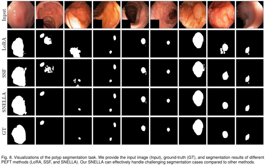 在下游任务的定性评估中,SNELLA同样表现出色。例如,在医疗影像的息肉分割任务中,它能更准确地识别和分割出病变区域。