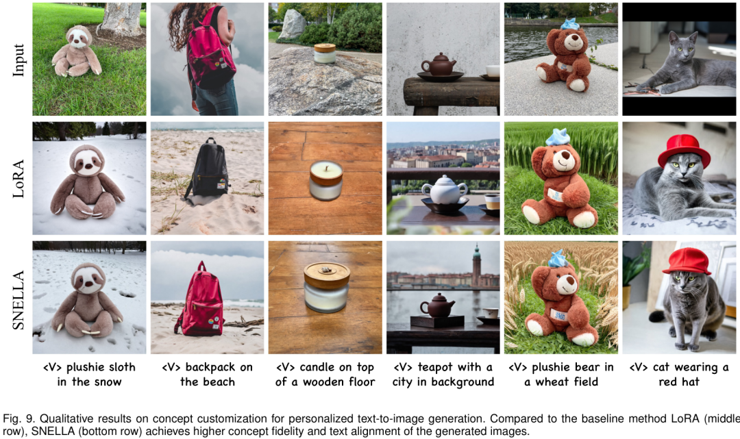 在个性化的文生图任务中,SNELLA也能更好地学习和还原特定概念的视觉特征,生成与文本描述更一致的图像。