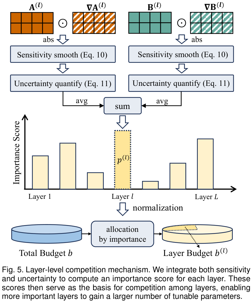 层间竞争:首先,模型中的不同层会根据各自的“重要性”来竞争可调整的参数预算。这个重要性分数综合了该层对任务损失的敏感性(sensitivity)和不确定性(uncertainty),越重要的层能分到越多的更新名额。