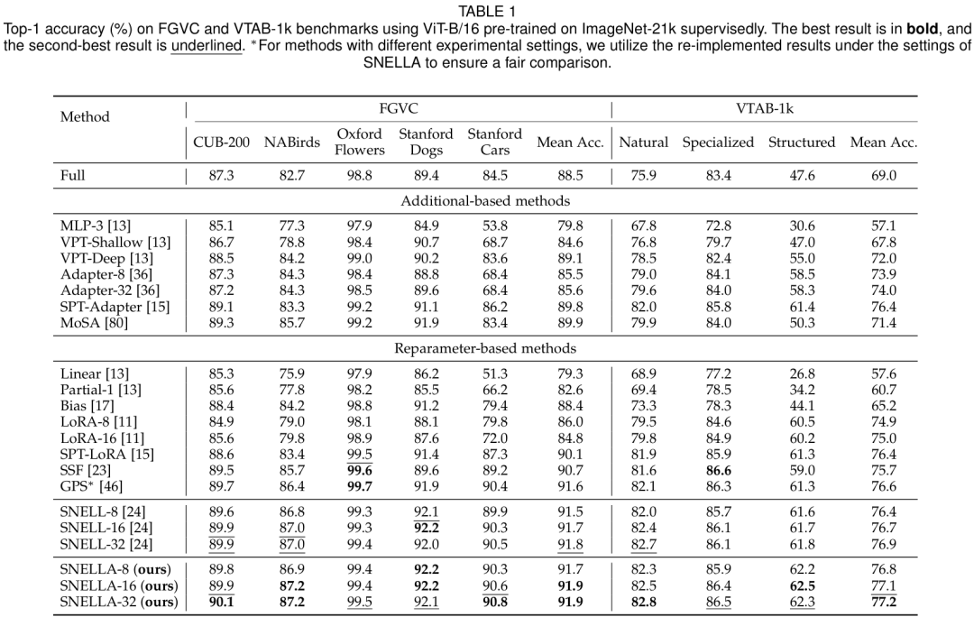 在标准的FGVC和VTAB-1k分类基准测试中,SNELLA全面超越了之前的方法。特别是在细粒度视觉分类(FGVC)任务上,相比强大的SPT-LoRA,SNELLA的Top-1准确率提升了整整 1.8% (从90.1%提升到91.9%),这是一个非常显著的进步。