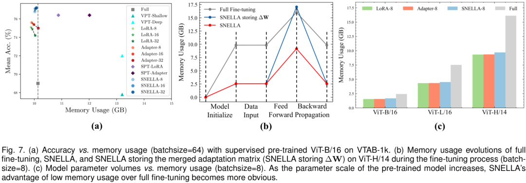 更令人印象深刻的是它的内存效率。实验表明,随着模型参数规模从86M增长到632M,SNELLA相比全量微调等方法,能够节省 31.1%到39.9% 的内存。这意味着我们可以在消费级硬件上微调更大、更强的模型。